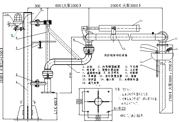 7、 安裝高度:汽車2700mm~2800mm(接口法蘭距地面高度,一般平臺(tái)高為2500mm,接口法蘭距平臺(tái)臺(tái)面H=200mm);火車火車棧橋上與鶴管連接處應(yīng)配有與鶴管相應(yīng)的標(biāo)準(zhǔn)法蘭盤,法蘭盤距軌面高度為3.7~4.0米。